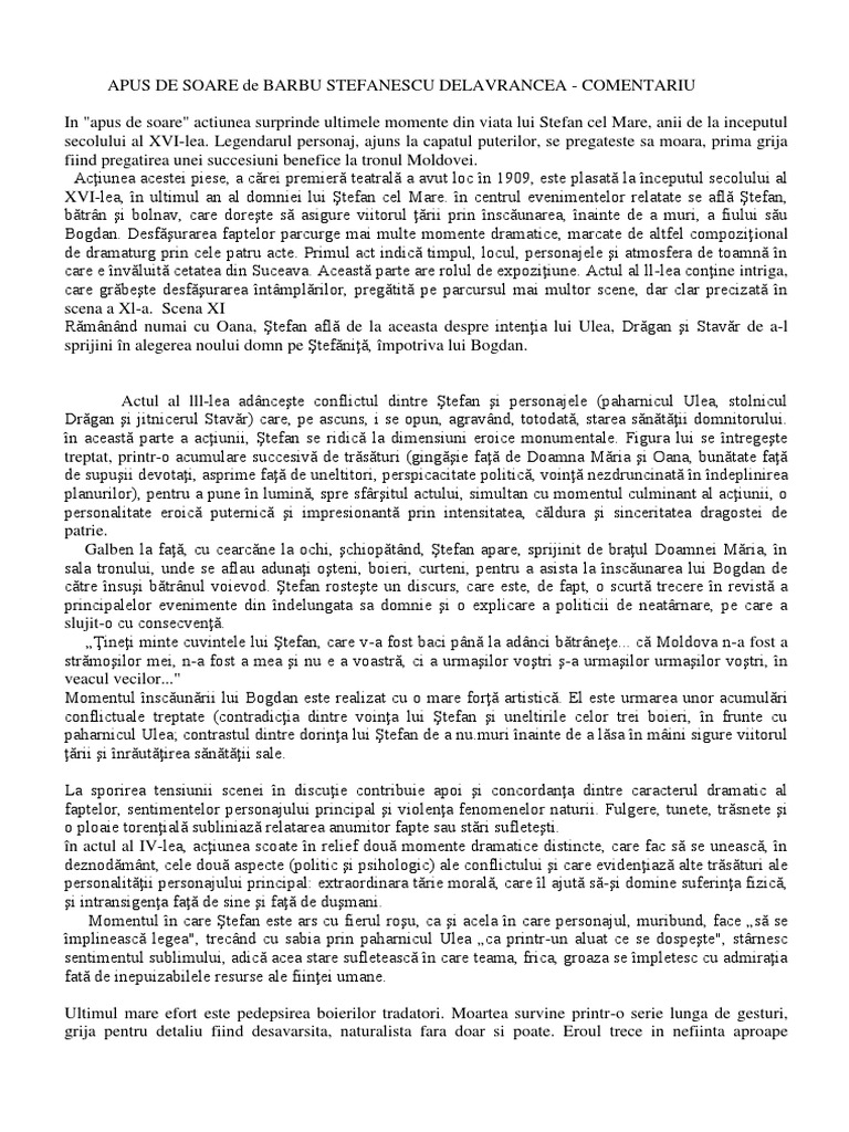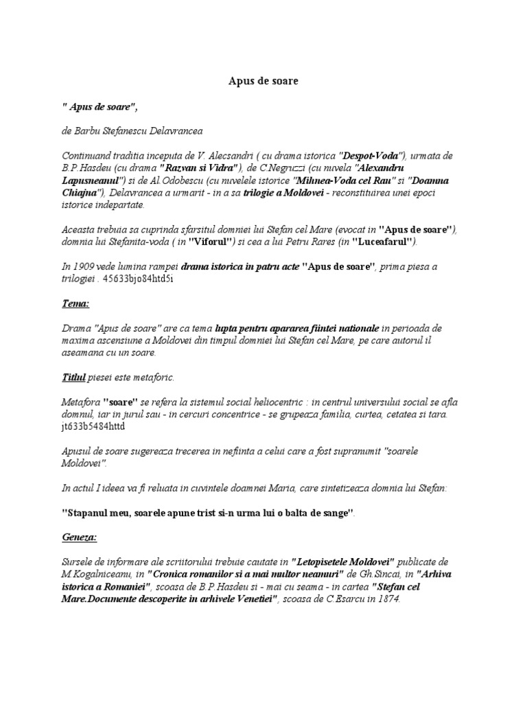 Apus De Soare Docx Source from : https://es.scribd.com/doc/179567705/Apus-de-soare-docx Barbu delavrancea este fiul unui carutas din margişnea bucurestiului. Ideea este ca lupta pentru apararea tarii subiectul este moldova in perioada de maxinia ascensiune sub domnia lui stefan cel mare si sfant, pe care autorul il aseamana cu un soare. O ploiță caldă stropise fâșia de drum. Barbu stefanescu delavrancea, proiecteaza in stefan imaginea unei personalitati electrizante, definite indeosebi prin patriotism. Accentuarea interesului pentru trecutul naţional, sub influenţa ideologiei paşoptiste, conduce şi în domeniul dramaturgiei la depăşirea unor etape a căutărilor delavrancea, cu apus de soare (1909).