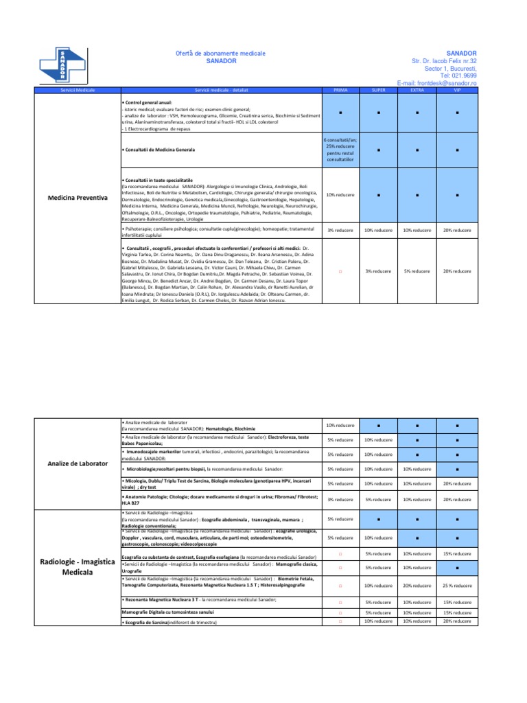 Vezi lista completa de preturi. Lista analize medicale pentru efectuarea analizelor medicale de laborator sanador este dotat cu echipamente moderne de ultima generatie spitalul sanador sanador str sevastopol nr 9 sector 1. Centrul medical sanador este o companie ce ofera intreaga gama a serviciilor medicale angajatilor companiilor nationale si internationale, persoanelor individuale si familiilor acestora.
