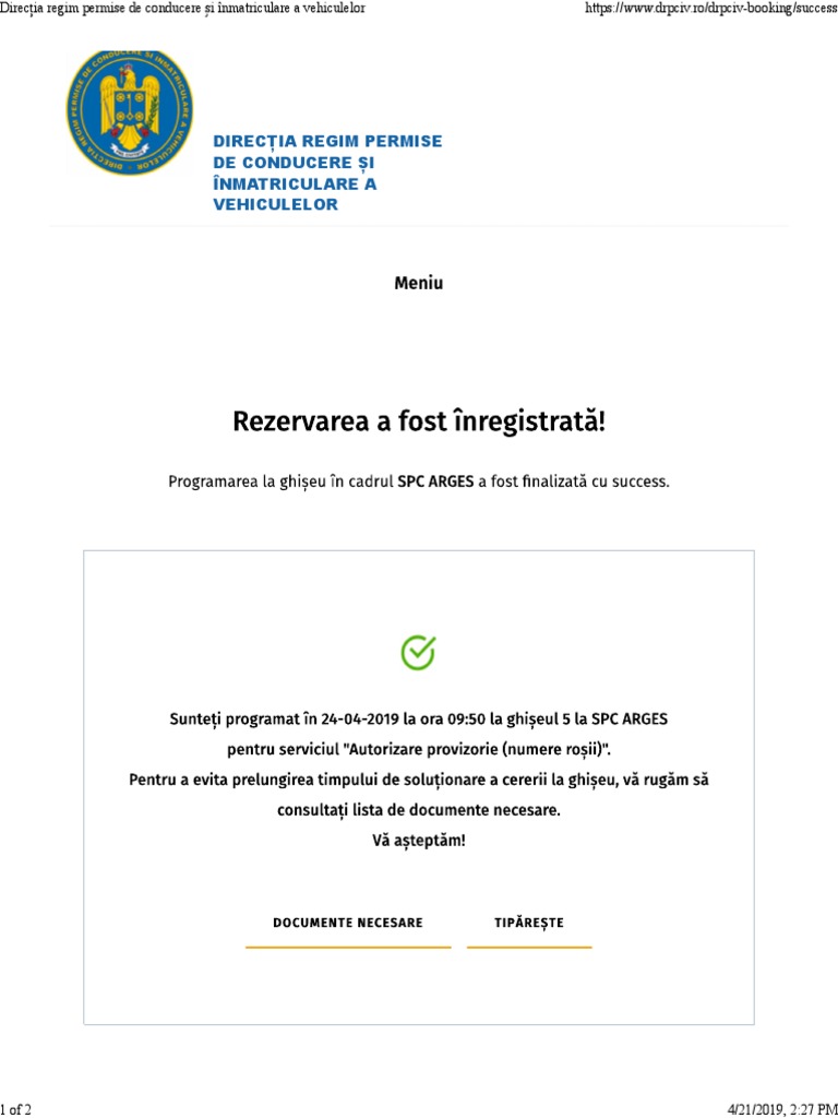 Direcția regim permise de conducere și înmatriculare a vehiculelor aduce la cunoștința cetățenilor, solicitanți ai în acest context, documentele eliberate de serviciile publice comunitare regim permise de conducere și înmatriculare a vehiculelor. Din cauza unor defecțiuni de ordin tehnic la nivelul unui server central al direcţiei regim permise de conducere şi înmatriculare a vehiculelor, joi 26 octombrie 2017, nu se vor putea desfășura activități cu publicul la nivelul serviciilor centrale si judetene. Excepţia autovehiculelor destinate competiţiilor sportive şi a vehiculelor istorice;