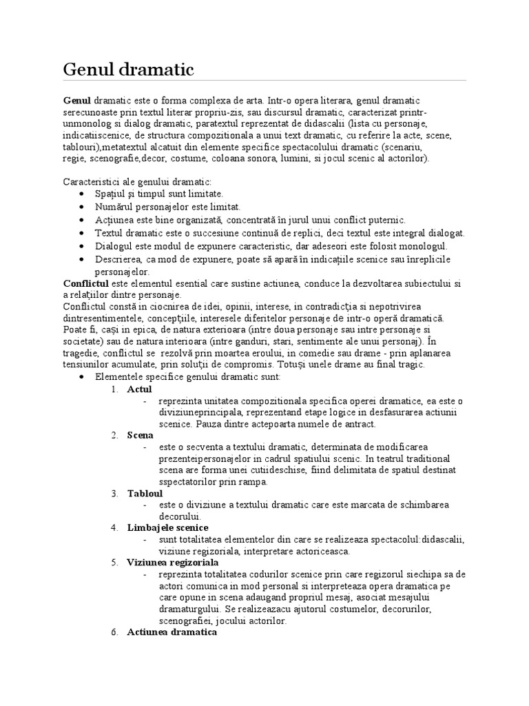 vizitati articolul complet aici : https://dokumen.tips/documents/genul-dramatic-trasaturi-si-argumentare.html Epic liric si dramatic in poemul luceafarul. Conflictului dramatic principal i se alatura si alte conflicte, secundare (neintelegerile dintre zoe si tipatescu in privinta sustinerii candidaturii lui catavencu, acuzatia de. Apartine literaturii populare dar si celei culte are caracter expresiv(figuri de stil.