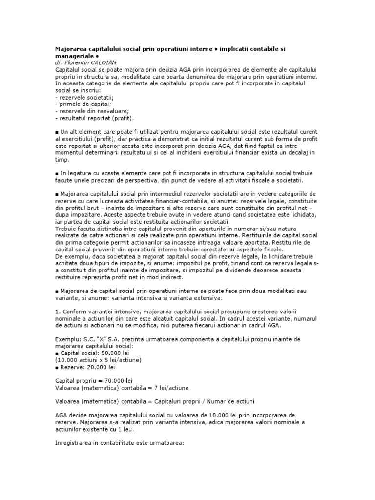 Modalităţile şi procedeele majorării capitalului social sunt reglementate de art. Tipul de impozit folosit (impozit pe profit sau impozit pe microintreprindere), schimbarea raportului dintre capitalul social si capitalul propriu (raport care trebuie sa fie mentinut in anumite. Are loc pe calea emisiunilor de noi actiuni sau parti sociale, a aportului intreprinzatorilor, a fuziunilor si prin operatiuni interne de capitalizare.